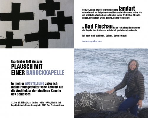 Seit 20 Jahren kreiere ich vergängliche landart, entweder mit vor Ort gefundenen Naturmaterialien oder indem ich mit gehäkelten Wollschnüren für eine kleine Weile Ufer, Strände, Felsen, Lavafelder, Krater, Bäume, Bäche verschnüre. In Bad Fischau ist es statt eines Naturraumes die Kapelle des Schlosses, auf die ich gestalterisch antworte.