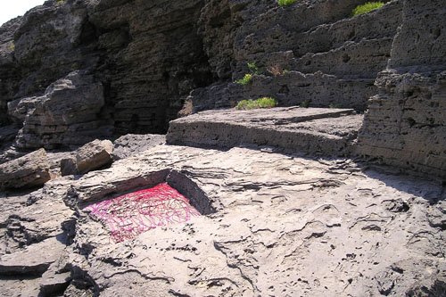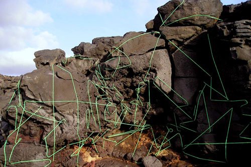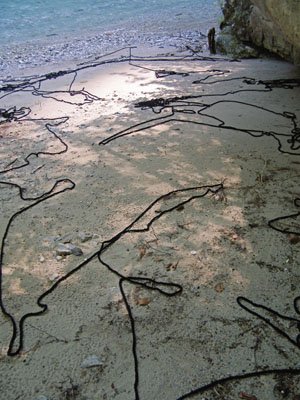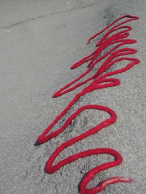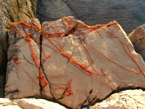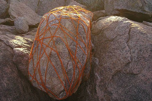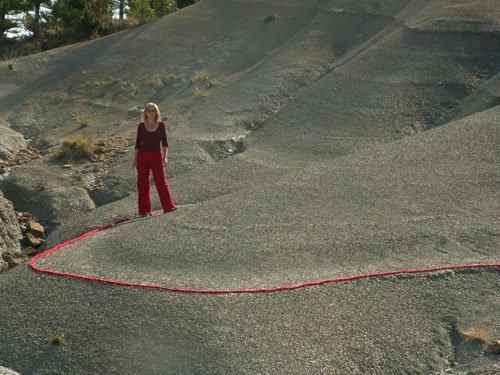 Eine 100 Meter lange Schnur aus roter Wolle markierte für mich eine Art Geburt: Ich hatte sie mir vor Jahren gehäkelt – bloß ahnend, dass sich mit ihr Spannendes erleben ließe. 2002 habe ich dann bei einer Sommerakademie auf Zakynthos mit ihr Dünen und Felsen verschnürt, Bäume miteinander verbunden, Bilder auf Felsen gezeichnet, in den Sand geschrieben. Das tat ich zwei Wochen unentwegt und setzte im nächsten Jahr fort. Inzwischen war aber klar, dass sich die Gestaltungssehnsucht eines Jahres niemals im Urlaub stillen ließe. Aus Folge daraus verbrachte ich alle meine Wochenenden im heimischen „Höllental“ mit landart. Aber auch das war nicht genug: Ich machte mich selbständig. Mit 44. Seit 2007 bin ich als Autorin, landartistin und Grafikerin tätig. Die rote Schnur hat mir den Weg gewiesen aus einer mäandernden, 20jährigen Suche nach dem, wie ich leben, was mein Ausdruck sein könnte.